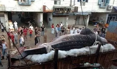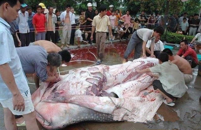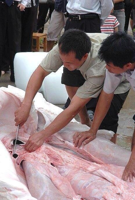 北海海洋之窗工作人员在海洋馆门口的空地解剖和制作鲸鲨标本。(图片来源:[3])