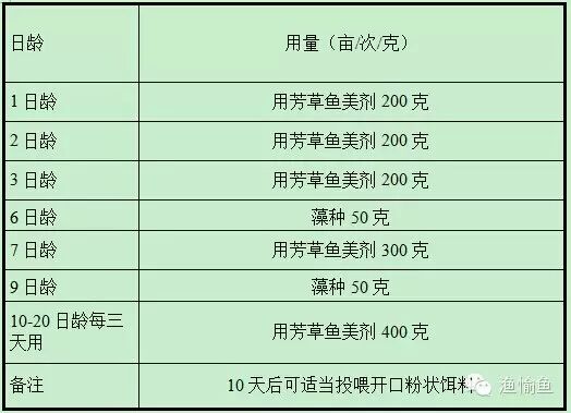 水花下池后,水花下池第2天或当天,每10万尾使用鱼美200克全池泼洒或每亩用200-400克。隔日一次,鱼美逐渐加量,池塘逐渐加水。每5天用一次培饵氧吧+多维+水美,(适当添加奶粉)![]()