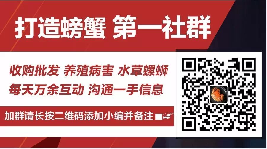 这里汇聚河蟹收购批发商,养殖达人,有最及时的一手价格及养殖技术!长按下方二维码添加小编(微信号:xierenxieshi)为好友并备注,可邀请您进螃蟹收购批发群、养殖精品群、蟹苗群、水草螺蛳群等群交流学习。