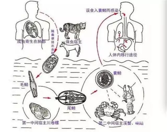 肺吸虫卵进入水中发育成毛蚴,并钻入第一中间宿主——螺体内形成胞蚴,以后发育为母雷蚴、子雷蚴,再发育成大量的尾蚴,尾蚴脱离螺体侵入第二中间宿主--石蟹、蜊蛄、小龙虾体内发育成囊蚴。人若吃了生的或未煮熟的石蟹、蜊蛄,囊蚴进入小肠,幼虫脱囊而出,穿过肠壁到腹腔,再穿过横膈进入肺内发育为成虫。