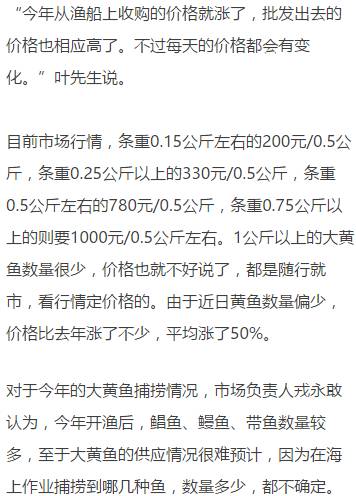 他告诉记者,今年开渔后,和去年相比,大黄鱼数量明显减少。市场较为常见的是条重0.5公斤左右的大黄鱼,条重0.15公斤以下的不多,条重1公斤以上的也很少。