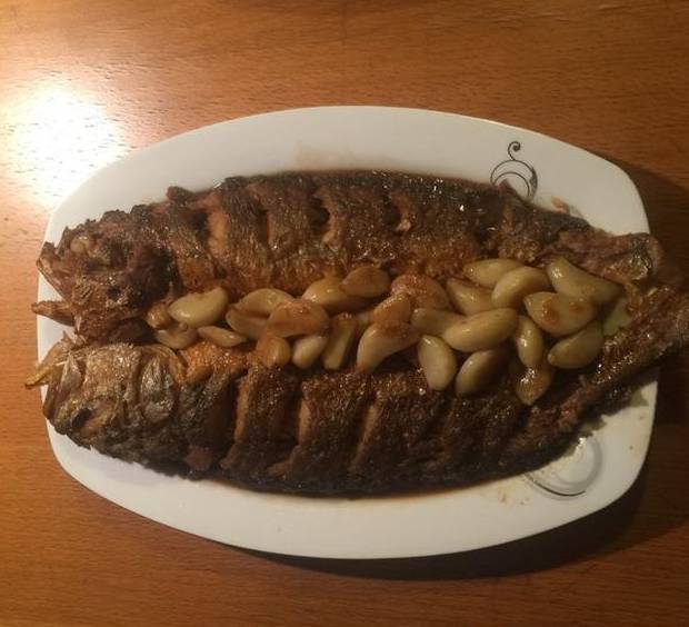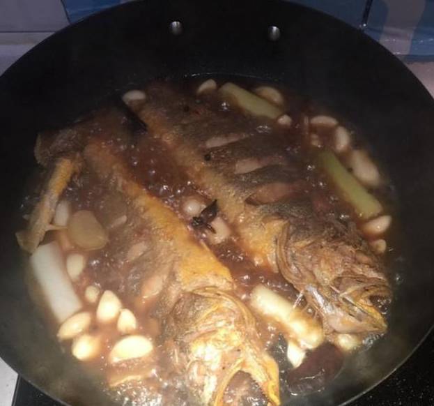 然后还要再下锅,油热后放入花椒,大料,辣椒爆出香味,放鱼添水,再加上大蒜,葱段,料酒,味极鲜,老抽继续烹饪!