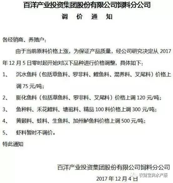 水产饲料价格调整通知:由于当前原料价格大幅上涨,为保证产品质量,经公司研究决定,从2017年12月16日0时起,对部分产品作价格调整,具体如下: