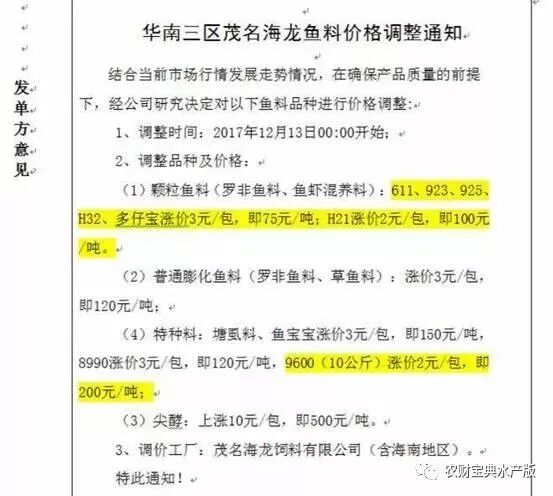 1、鱼苗宝系列涨200元/吨(20公斤装的涨价4元/包);