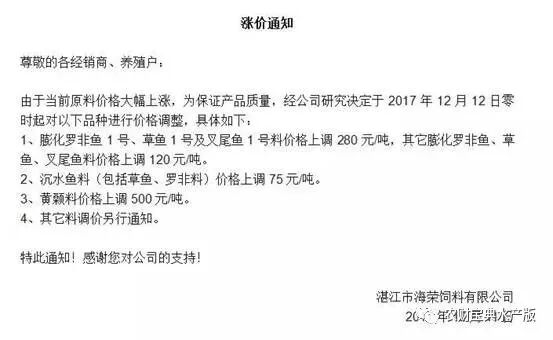 由于鱼粉、豆粕等原料大幅上涨,为保证产品质量,经公司研究决定于2017年12月15日零时起对以下产品价格进行调整: