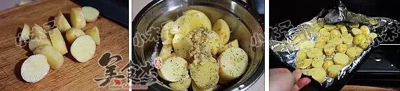 2.土豆去皮切两半,加上盐、油、蒜蓉、迷迭香拌匀,预热烤箱之后用220度烤约25分钟至熟