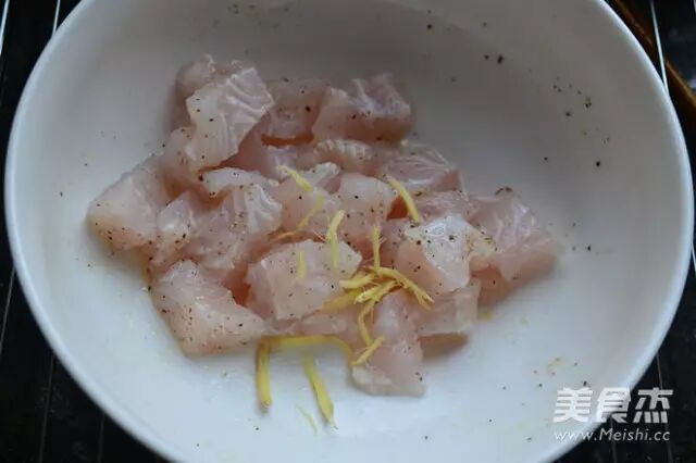 1.龙利鱼解冻后用厨房纸擦干水分,切成1.5厘米见方的块,加入适量橄榄油、少量黑胡椒、姜丝腌制15分钟。