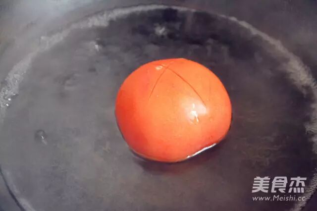 2.番茄顶上用刀划十字,放在滚水中烫一下,这样很容易去皮哦!
