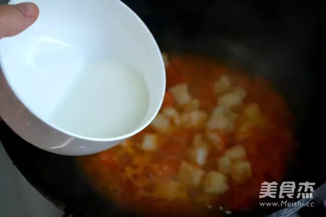9.小半碗水和玉米淀粉混合成水淀粉,然后倒入锅中大货煮开,收汁浓稠,然后加一小勺盐、一小撮糖调味出锅就好啦
