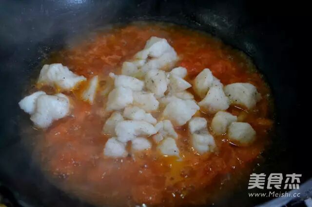 8.水开后放入煮熟的龙利鱼块,煮2分钟左右