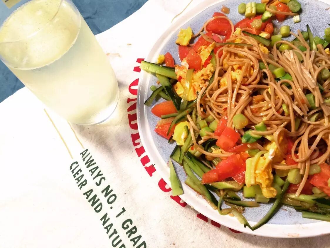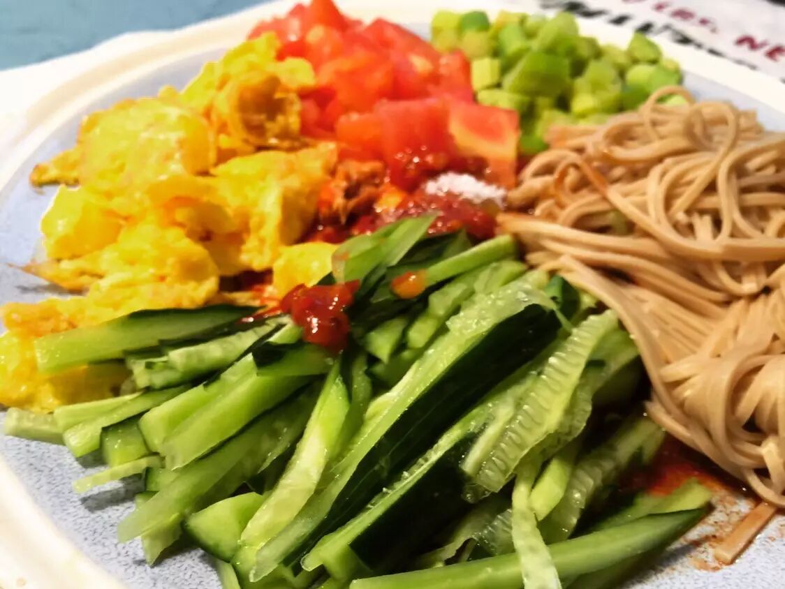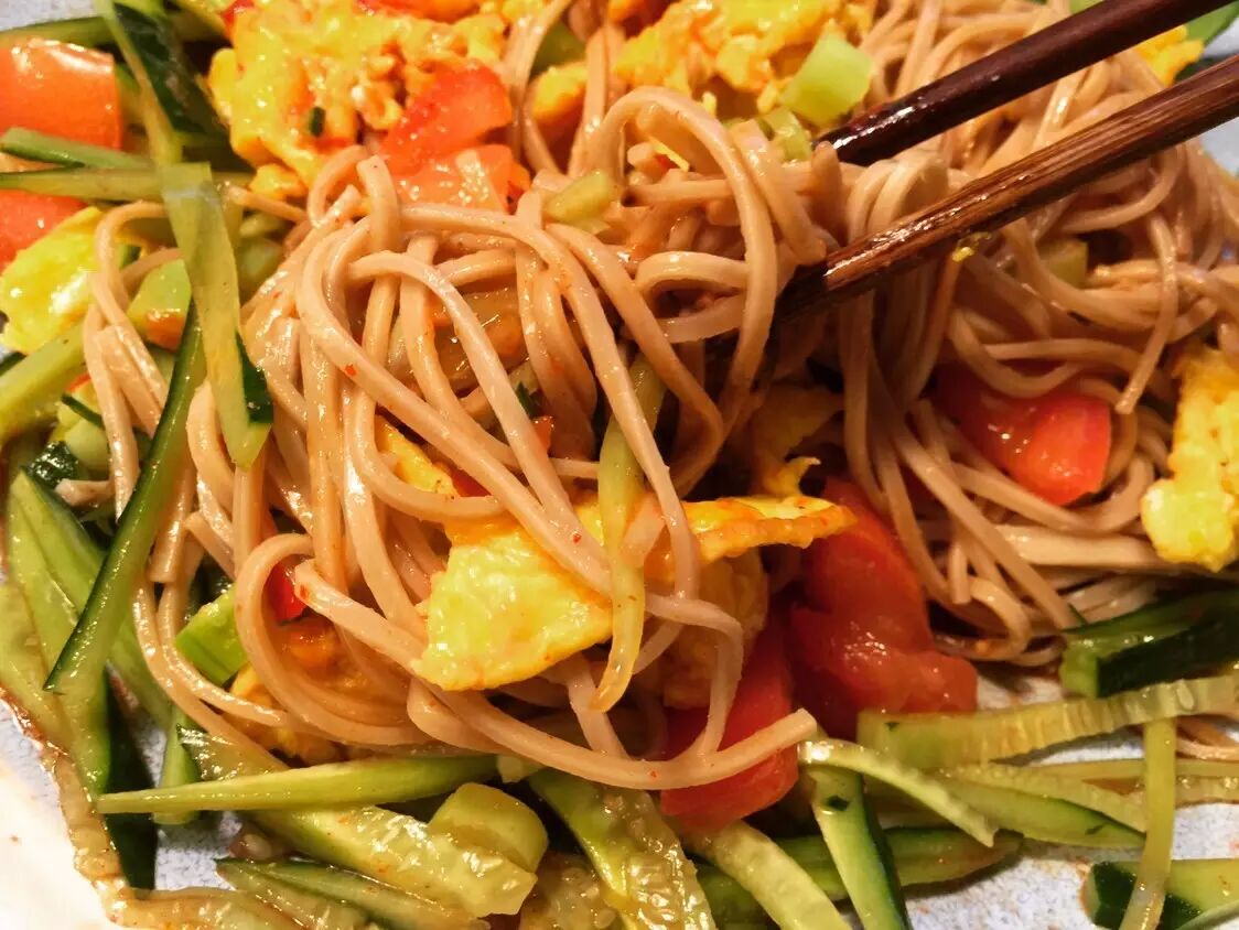 材料:面(夏天可以选择荞麦面或燕麦面)、黄瓜、西红柿、鸡蛋、其他蔬菜和配菜