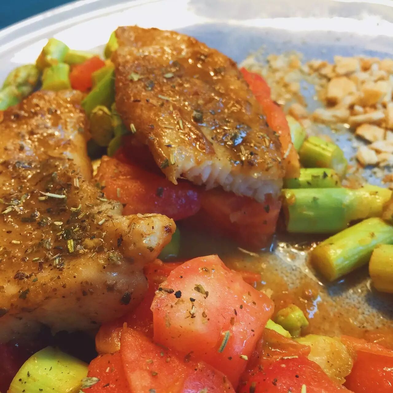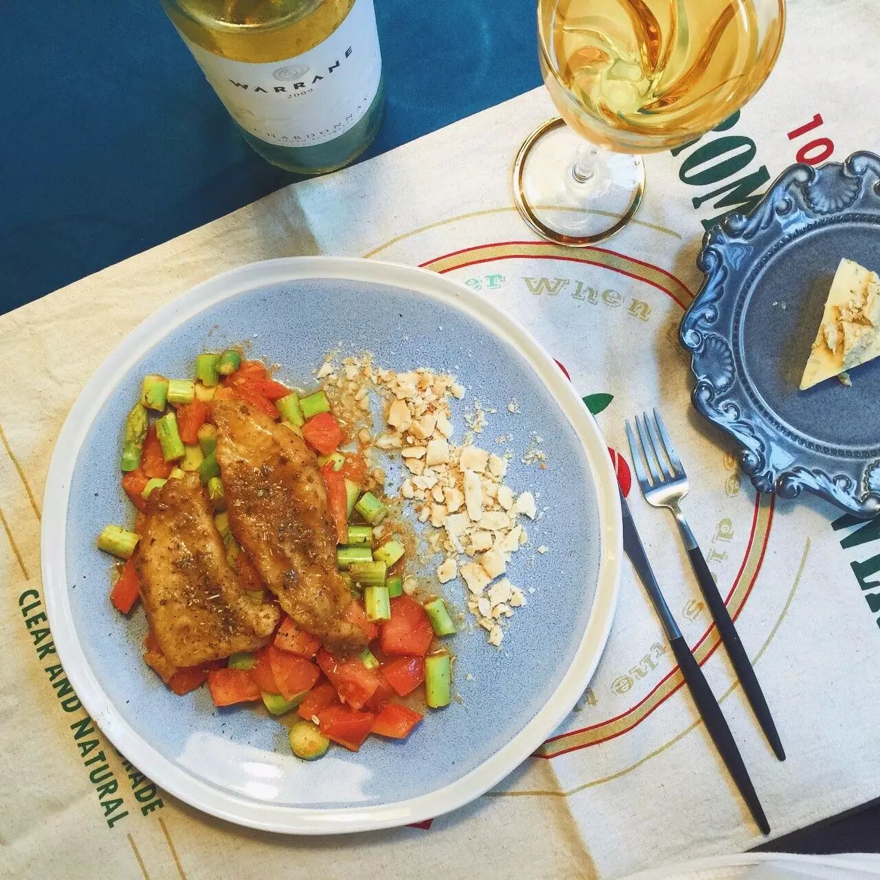 蔬菜切碎炒熟后摆在盘子上,热锅放一点油放入龙利鱼。大火将鱼的两面煎到微微变白,关上锅盖转小火焖熟。这样煎出来的鱼超级嫩~