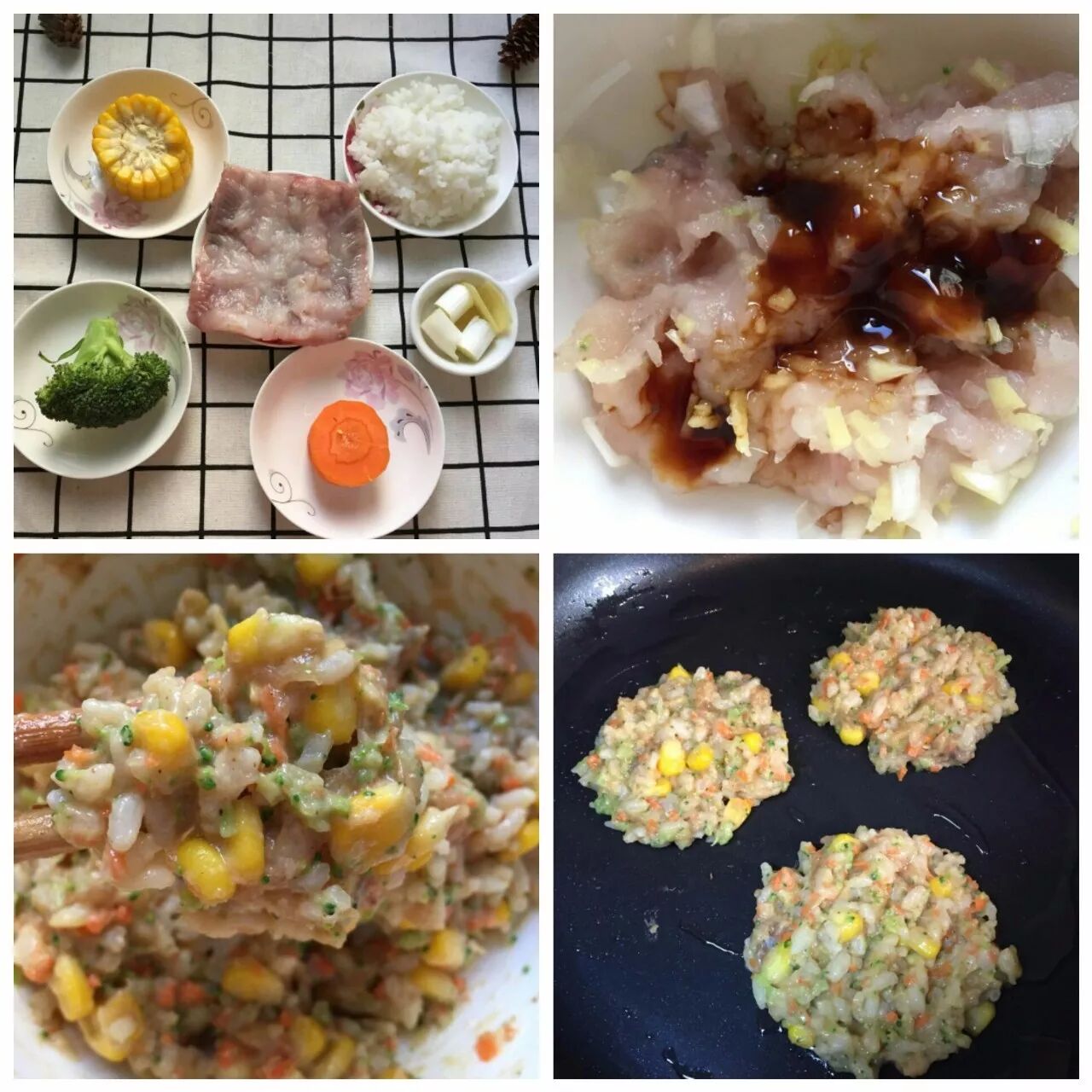 1.准备熟米饭、龙利鱼肉 胡萝卜、熟玉米、西兰花、葱姜。
