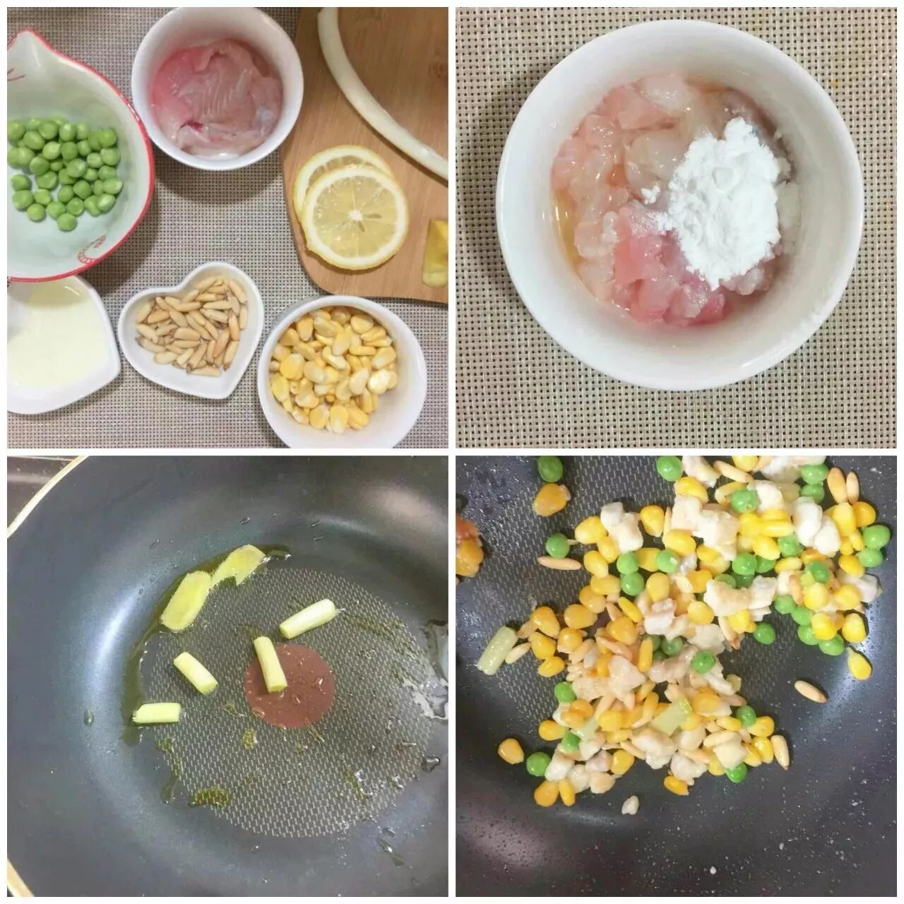 1.龙利鱼肉去皮去刺,切直径一厘米左右小丁放柠檬片去腥15分钟。玉米粒,青豆粒,剥好的松子。