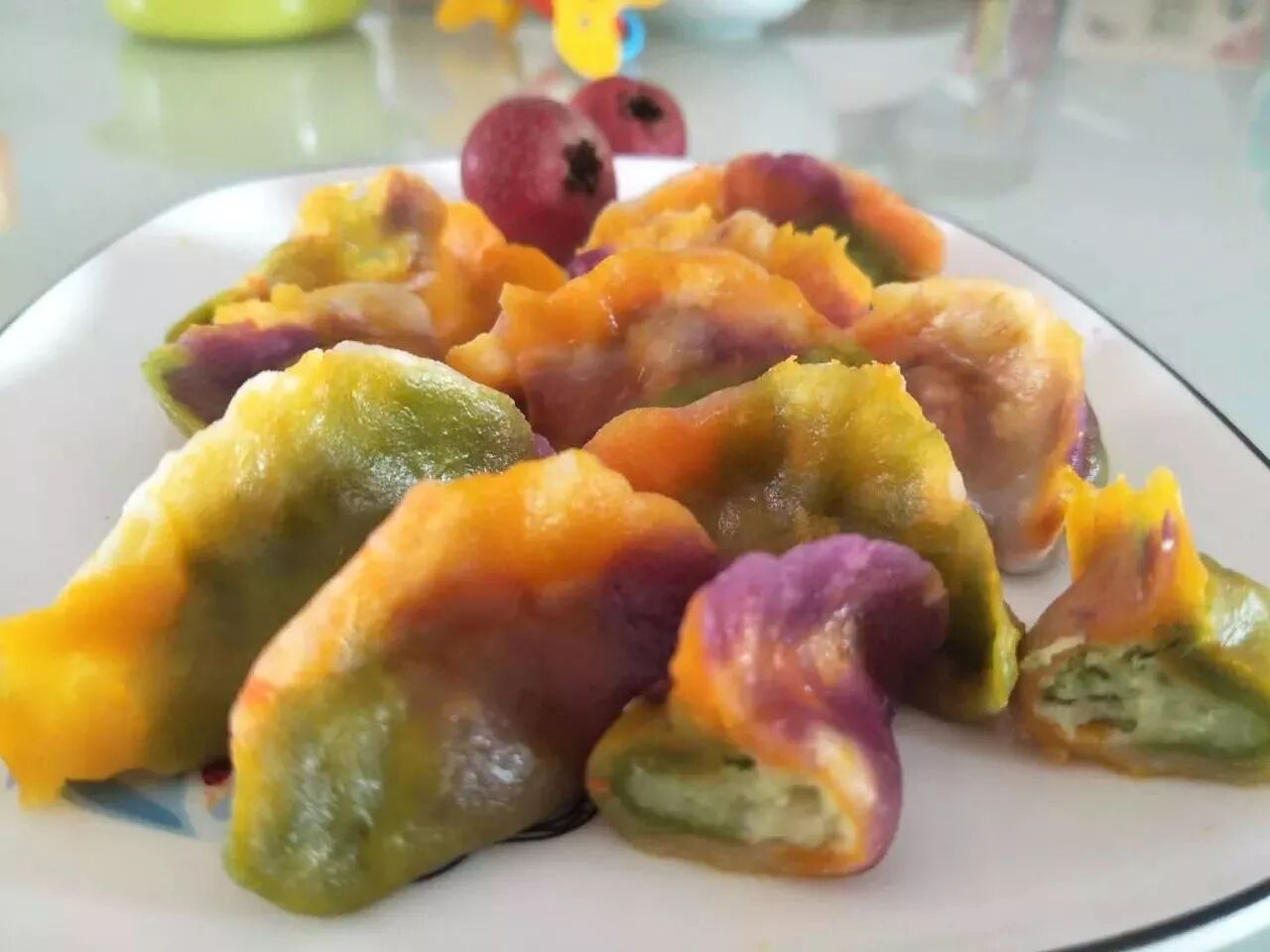 1.用胡萝卜汁、菠菜汁、南瓜汁分别和好面。