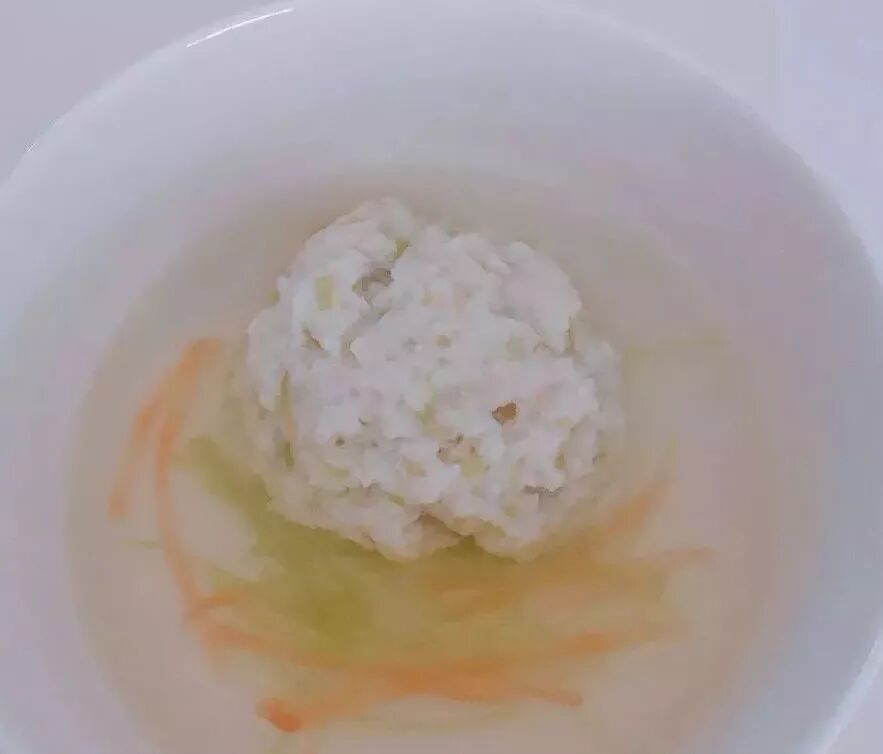 4.龙利鱼泥中加入莴笋碎末,加半个蛋清,加少许淀粉,搅打至粘稠