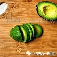 2. 牛油果用刀中间切一刀,两手一拧,取出核,剥去外皮,切成片。