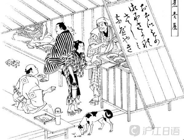 至于“煮卖”是从什么时候开始出现的,至今并没有一个清晰的界定。但宽文元年(1661-1672年)12年的12月23日曾颁布过《煮卖夜商禁止令》,可以确定在此以前便有“煮卖”。另外,宽文10年7月曾下令禁止下午6点后经营“煮卖”,由此可以推断出此时已有固定经营“煮卖”的店铺。