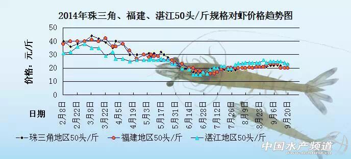 下图是2014年珠三角地区、湛江地区和福建地区50头/斤规格对虾的价格趋势图。整个图很明显的就可以区分为2个不同的部分:2月份到4月份整体的虾价处于非常高企的状态;5月份至6月下旬整体虾价就一直不断下滑,整体价格比较低迷,7月初虾价开始出现上涨,9月中旬虾价再次出现下滑。具体价格趋势如下: