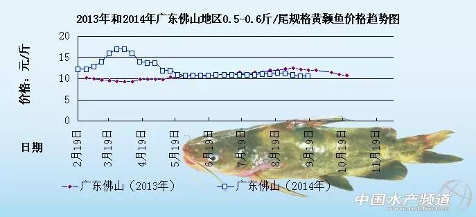 下图是2013年和2014年广东佛山地区0.5-0.6斤/尾规格黄颡鱼的价格趋势图,有图中可以看出2014年2月中旬开始,黄颡鱼的塘边收购价格就一直持续上涨,直到5月下旬鱼价才开始有所回落。2014年5月下旬至今的鱼价都是处于持续平稳的状态,这段时间的鱼价跟2013年同期的鱼价基本持平。从9月初开始鱼价开始下跌,下跌幅度较大,预计在国庆节之前广东地区的整体鱼价将会持续低迷状态,价格不会有太大浮动。具体趋势如下: