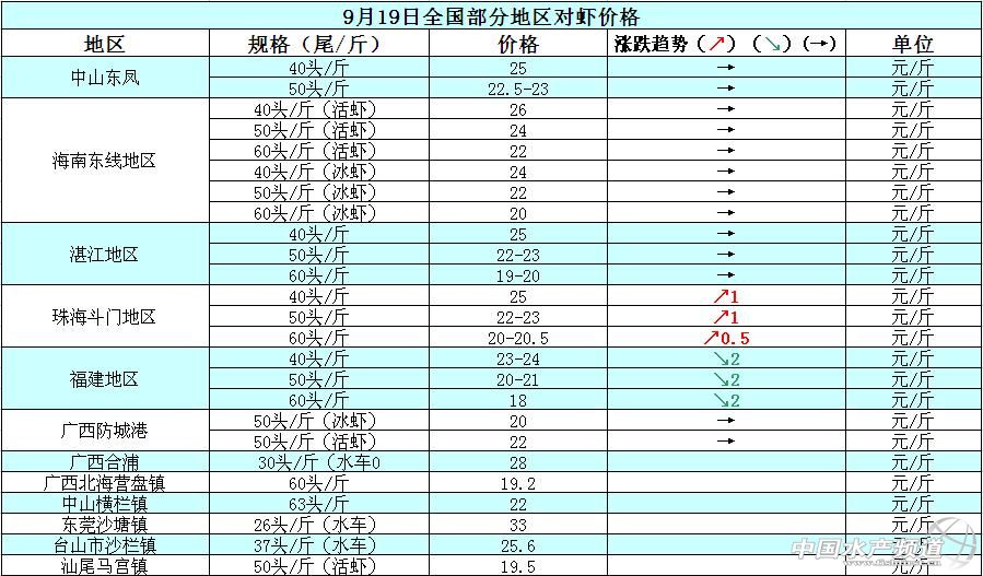 据悉,进入9月份各地合规格的对虾存塘本就偏少了,台风“海鸥”过后,海南和粤西沿海地区很对虾塘被水淹没,存塘对虾有部分被海水冲走,剩余的也开始有发病的迹象,近两天各地的对虾出塘量都很少,预计后市的虾价将会有较大的上涨空间。具体价格如下: