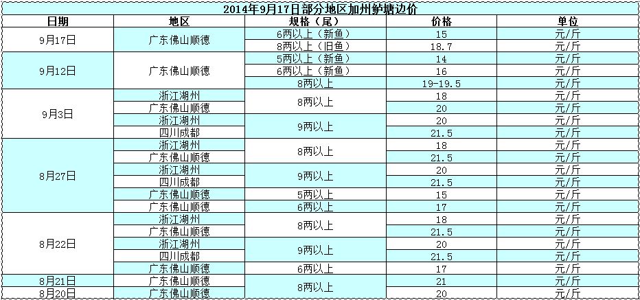 据悉,现在已经是9月下旬了,外省地区已经的天气已经明显转凉,所以近期外省地区的黄颡鱼出鱼量很多,但是整体市场的需求量偏少,外省地区出鱼量多了,广东地区的出鱼量就减少了,至于价格方面,预计在国庆节之前广东地区的整体鱼价都将维持现状。具体价格如下:
