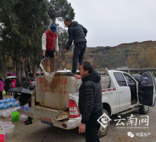 车上拉着鳙鱼、鲫鱼、草鱼、鲢鱼等种类的5000余尾鱼