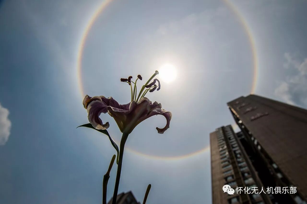 5月16日中午,怀化城区上空出现了日晕现象。日晕也叫圆虹 ,一种大气光学现象,是日光通过卷层云时,受到冰晶的折射或反射而形成的。当光线射入卷层云中的冰晶后,经过两次折射,分散成不同方向的各色光。有卷层云时,天空中会飘浮着无数冰晶,在太阳周围同一圈上的冰晶,都能将同一种颜色的光折射到人的眼睛里形成内红外紫的晕环。