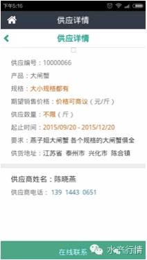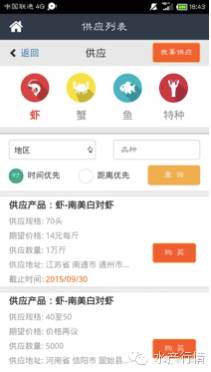 如果您是供应者,可以点击“供应”,发布您的水产品供应规格、期望价格、供应数量、地址、产品实拍图片等信息,也可以查看求购信息,选择时间或者距离优先排序,从求购中找到自己可以供应的货源进行报价和联系交易;