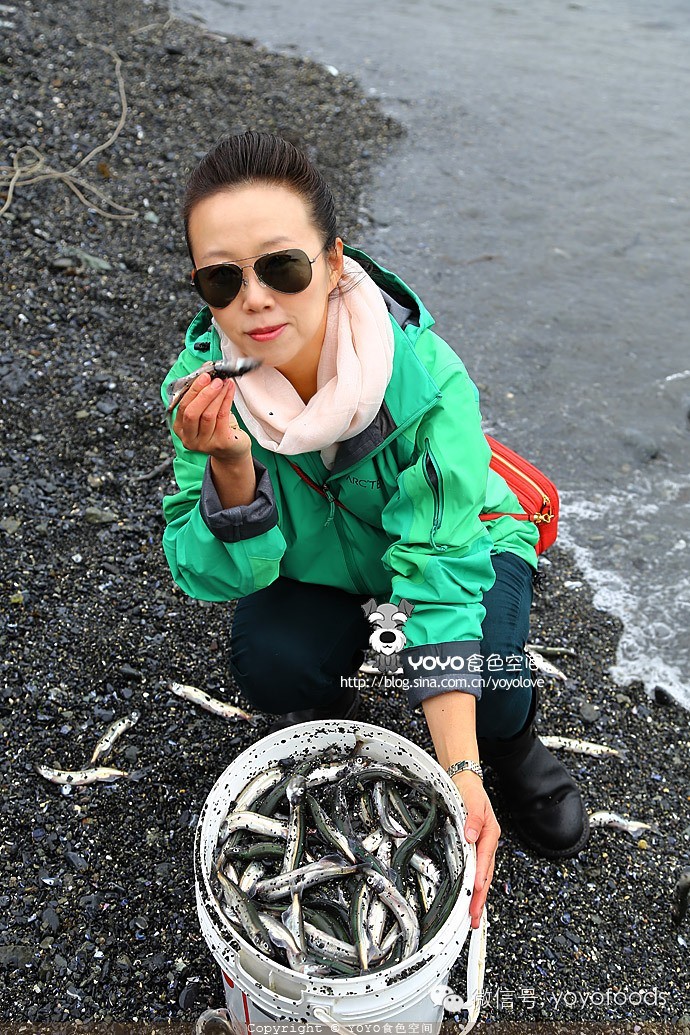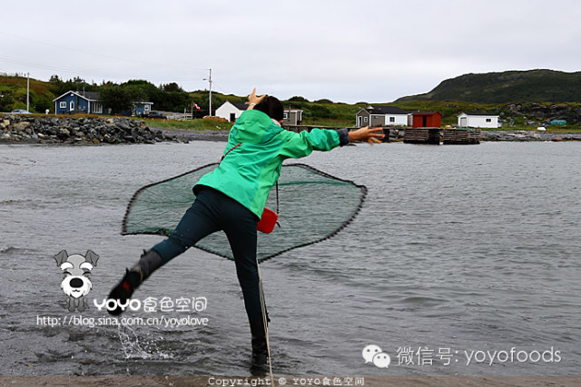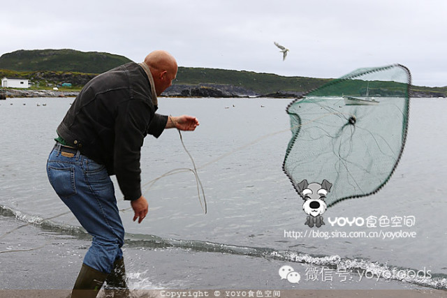 Noddy Bay的海边,我见到了如同硬币罐子一样塞满海滩的多春鱼。随着海浪,多春鱼组成的绵长鱼群,一遍遍冲刷着碎石沙滩。Carl演示了一下渔网的用法,就交给我们这些跃跃欲试的新手了。
