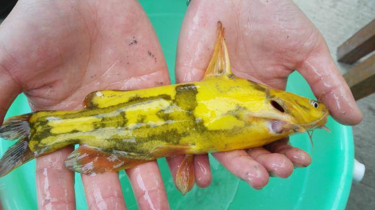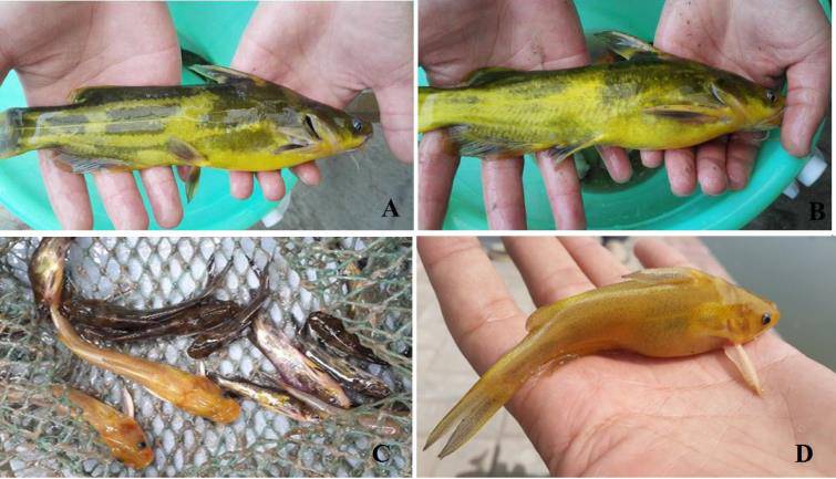▲图6 “香蕉鱼”塘头出现的一半黑、一半黄的黄颡鱼异常体色