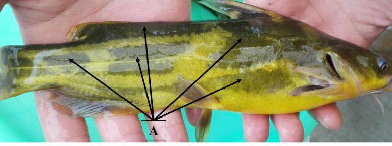 从鱼体皮肤表面沉积的位置来看,黑色素细胞主要沉积在图4所示A处位置。其余位置也存在少量黑色素细胞。具体描述参见2015年文章《黄颡鱼体色变化及黄化问题浅谈》。