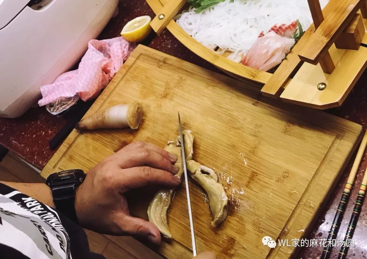 将贝身和象拔分开。贝身质地比较柔软,可以切稍微厚一点的片。
