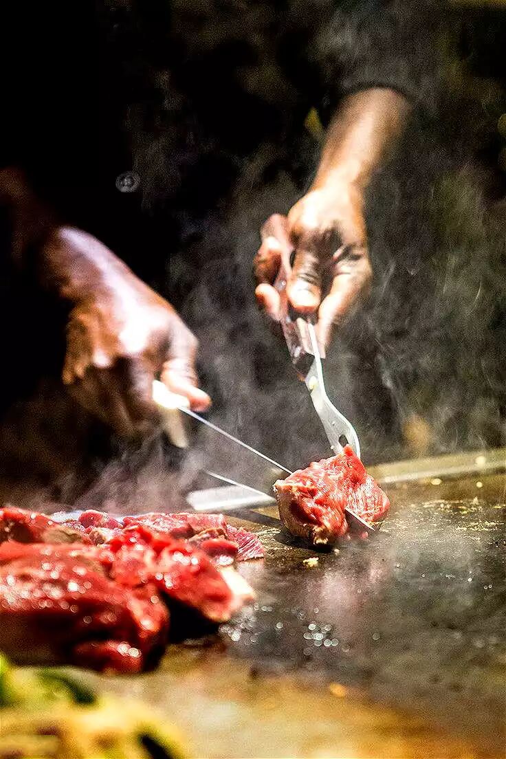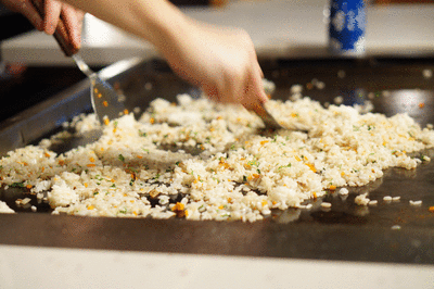 铁板烧顾名思义,就是在一张烧烫的大铁板上迅速煎烤食物,但必须由经验丰富的厨师操作。因为食材上至高级牛肉、海鲜,下到蔬菜、炒饭、煎饼,需要的火候和熟成度各不相同,想要快、狠、准地用高温热油封存住食物的鲜嫩口感,得有娴熟的技巧。也因此,食客观赏现场制作的铁板烧,成为日本料理的又一特色,又因不能回锅重新加热,又称“即席料理”。