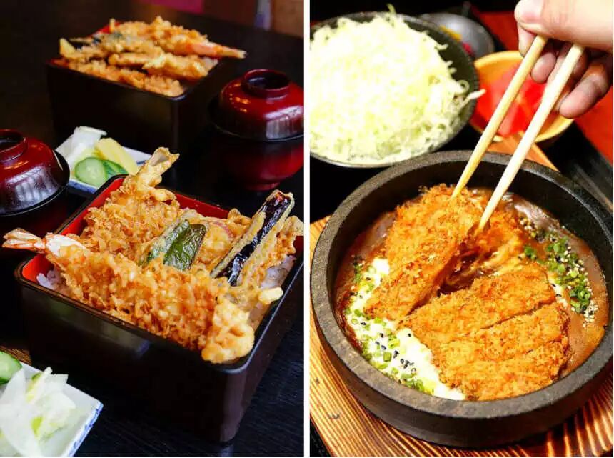薄浆炸一切:虽然日本料理以清淡著称,但日本人对油炸菜式的喜爱也很有名,几乎所有食材都可以裹上特质的轻薄粉浆入油锅,炸出外酥里嫩的销魂口感,再配上清爽的卷心菜、萝卜泥,蘸以柴鱼高汤和日式酱油。最为人熟知的炸物当属炸虾天妇罗,不过天妇罗并不只一种——关东地区流行的是我们常吃的那种,不能用来做天妇罗的食材只有米和谷类;关东地区流行的则是油炸的鱼浆制品,又叫甜不辣。