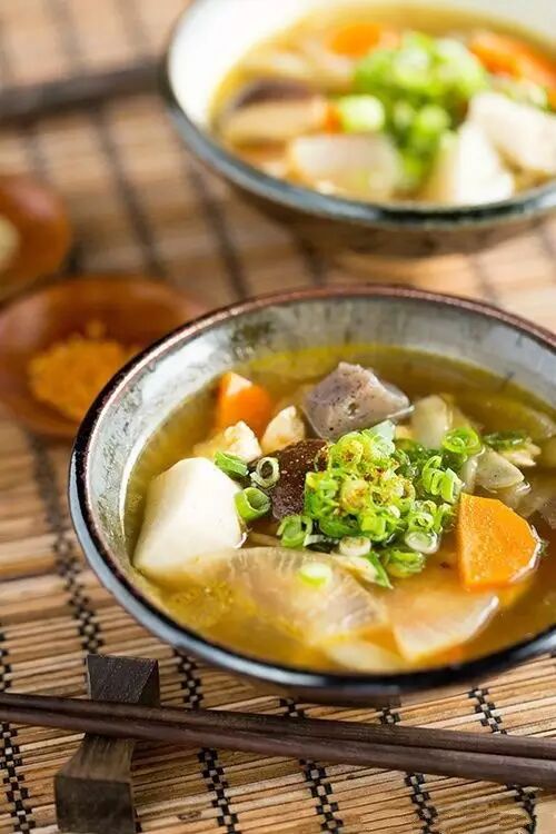 清口用淡汤:汤在日本餐桌上的主要功能,是清除口中残留的前一道菜的味道。按宴席上的形式,日式汤分为“先碗”和“止碗”。先碗是前菜之后上的饭前汤,大多为柴鱼昆布熬煮的清汤;止碗则在最后与米饭一起上,通常是较为浓郁的味噌酱汤——日料店里的定食常有“一汁N菜”的组合,这个“汁”,指的也经常是它。当然日本人日常喝的汤不只两种,但也以清淡口味为主。