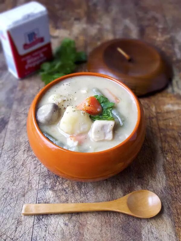 煮到最后下入白饭,就能喝到香浓的鸡汤蔬菜粥