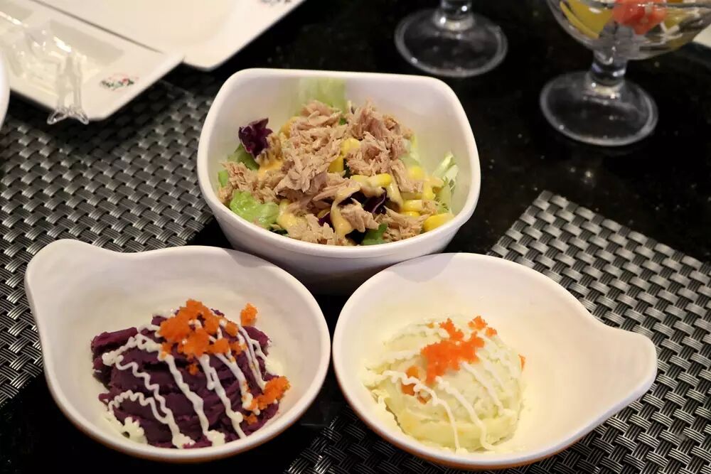 虽说是附赠的菜品,但沙拉也用了金枪鱼,也是够壕;把土豆泥和紫薯泥当饭吃的花菜更是直接拍了两碗;