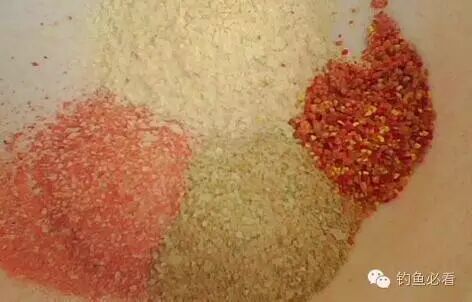 ㈢粗细搭配最为典型的是颗粒饵!颗粒饵是指使用机械的挤、压、烘、膨化等工艺形成的颗粒状饲料。我们知道,北方与南方因为原料成本、喂养品种不同、颗粒本身配方也不同。在实践中,我们大体了解到,北方颗粒多有豆粕,鱼粉,动物、植物蛋白含量高。南方夏季气温高,颗粒中多用菜子饼、玉米、米糠、麦麸、骨粉。因而北方颗粒比较粘,南方地颗粒比较散。竞技垂钓者在比赛中谁都想找到本塘颗粒,因为本塘颗粒就是该鱼池的万能饵!然而,制作颗粒饵用于垂钓,并不是一件简单的事情。在一些竞技比赛中,本塘颗粒饵犹如鱼的圣餐,是选手们都希望得到地。颗粒在使用前,要使用机械进行粉碎,也可以通过水浸泡,再与其它辅助饵一并制作。粗细搭配需要比例,在南方江浙一带,颗粒用量大约在50%左右,其它辅助性饵可以占到50%。粗细搭配可以用同一把饵料来完成,也可以采用开两把,或两把以上的饵来实现。例如,打窝饵与钓饵分开,在钓混养、野外垂钓时采用比较好。在实际施钓活动中用底窝饵与钓饵分开是人们常采用的做法。