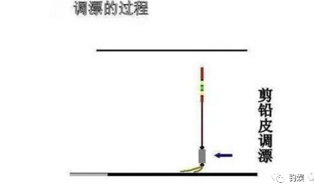 首先调第一坠,选择略重一些的铅皮,然后把漂子完全沉入水中开始剪铅皮, 使得漂逐渐上升,直到漂尾全部露出即可。接下来在脑线上缠上第二坠铅皮,把漂子沉入水中开始剪铅皮,漂子逐步上升直到漂尾顶点至平水时即可。在垂钓时,需要根据钓位水的深浅上下移动漂座,使得漂尾露出一目就可开始垂钓,这种调法钓鲫鱼时送漂上升幅度大、信号也比较明显。
