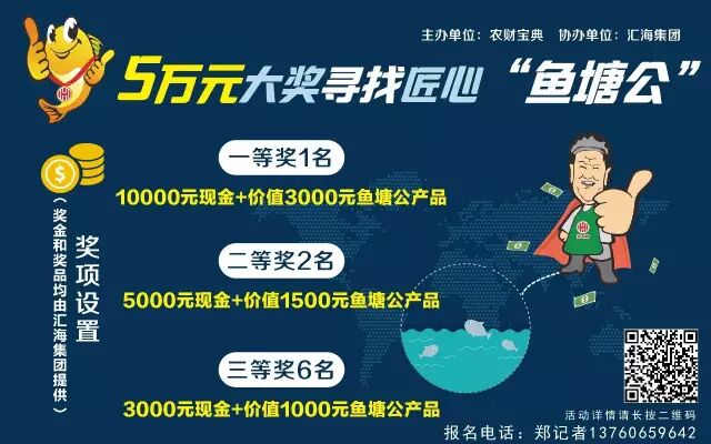 6月中旬,由农财宝典和汇海集团共同举办的“五万元大奖寻找匠心‘鱼塘公’”活动启动后,便受到广大养殖户热烈支持,参赛报名者众,接下来组委会报道小组将对入围的参赛选手进行回访报道,定时跟踪赛事进展。走过路过,千万不要错过5万元大奖哦,还没报名的你,现在联系郑记者13760659642(微信同步)还来得及哦!