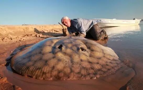 杰里米?韦德在阿根廷境内的一河岸处与一条巨大鳐鱼合影。
