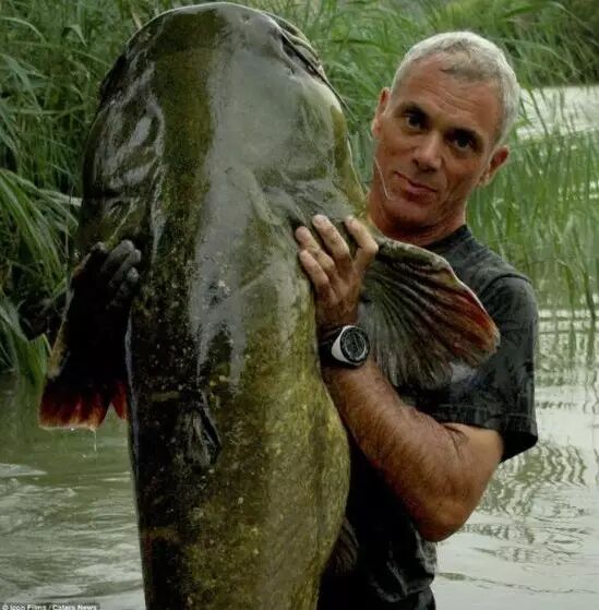 六须巨鲇多生活在欧洲,重150公斤。图中的这条巨鲇是“河怪”猎人杰里米?韦德在西班牙捕捉到的。