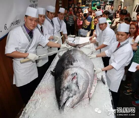 2011年6月,韩国首尔一家饭店的厨师们在展示巨型金枪鱼。当日,一条打捞自济州附近海域的巨型金枪鱼被运送到首尔,成为饭店一景。这条金枪鱼重达350公斤,长达2.7米。