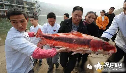 2008年12月8日,一个渔民在嘉陵江江北城水域打鱼时,意外打到一条长1.3米,重达29公斤的胭脂鱼。重庆某渔港老板张某知道此事后,拿出12000元钱,重金购买了此胭脂鱼,并放生。图为张老板和员工将鱼抱向放生水域。