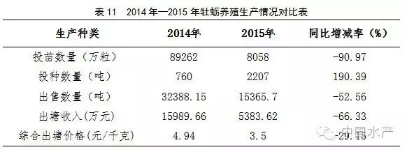 2015年,渔情采集点牡蛎投苗数量8058万粒,同比减少90.97%;投种数量2207吨,同比增加190.39%;出售牡蛎15365.7吨,同比减少52.56%;市场价格3.5元/千克,同比下降29.15%;收入金额是5383.62万元,同比减少66.33%(表11)。