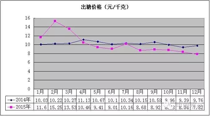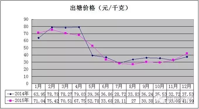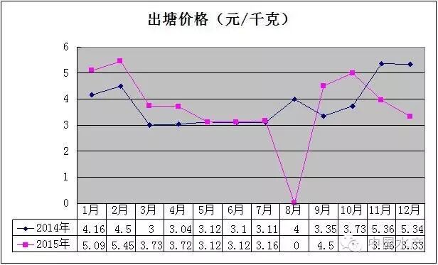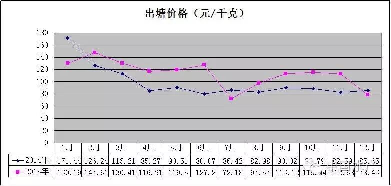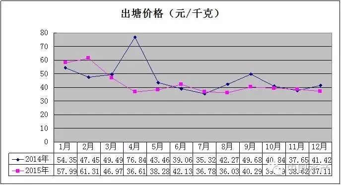 从图6看出,2015年牡蛎整体价格同比有所下降,但1-10月份价格同比都保持高位运行,8月份没有出塘,由于11-12月份价格同比大幅度下降,出塘量同比也下降,才造成综合出塘价格总体下降。