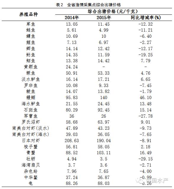 2015年,全省渔情采集点综合出塘价格15.8元/千克,同比上涨8.82%。采集点有9个品种出塘价格同比有上涨, 17个品种出塘价格稍有下跌。由于采集点转养其他品种原因,2015年黄颡鱼没有出塘价格,导致出塘价格同比下降100%(表2)。