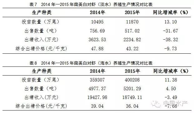 2015年,渔情采集点投放南美白对虾(淡水)11870万尾,同比增加13.1%;出售成虾517.02吨,同比减少31.67%;收入金额是2234.82万元,同比减少38.32%;市场价格43.22元/千克,同比减少9.73%(表7),南美白对虾(海水)400208万尾,同比增加11.38%;出售成虾5201.29吨,同比增加4.5%;收入金额是18749.11万元,同比减少3.49%;市场价格36.04元/千克,同比减少7.68%(表8)。