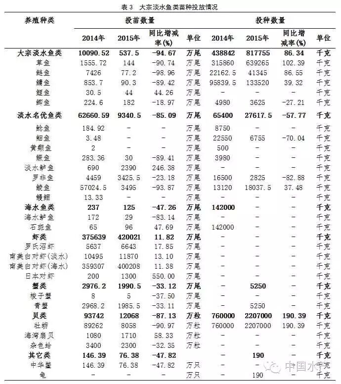 2015年,全省渔情采集点投苗量444158.88万尾,同比减少18.58%,投种量3057.91吨,同比增加117.45%。草鱼、鳙鱼、鲢鱼、鲫鱼、鲶鱼等17品种投苗量同比减少,鲤鱼、淡水鲈鱼、罗氏沼虾、南美白对虾、海湾扇贝等8个品种投苗量同比增加,大宗淡水鱼类投种量普遍同比大幅度增加(表3)。